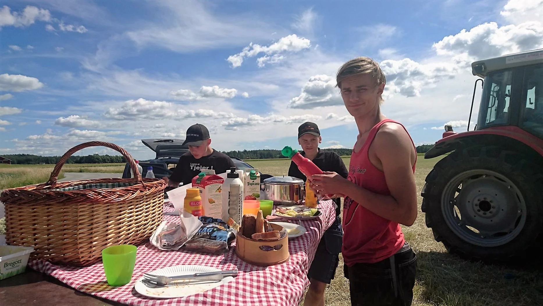 Vi håller starkt på traditioner. Det är viktigt att fylla på energi när man är lantbrukare, Den obligatoriska rutiga duken är er stark tradition på lunchen